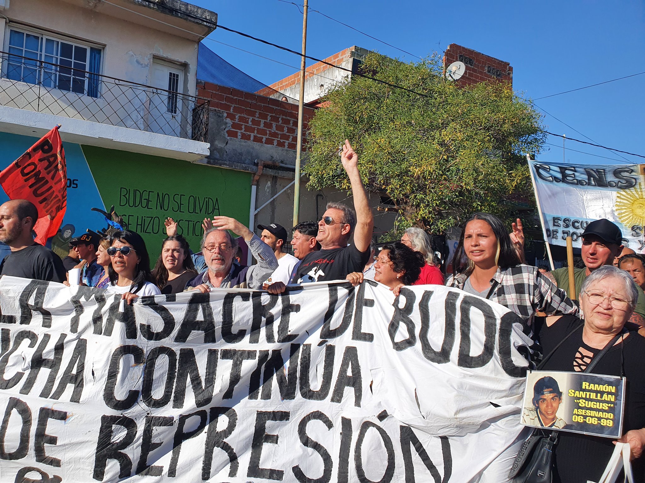«A 35 años de la Masacre de Budge, la lucha continúa. Basta de represión. Negro, Willy, Oscar; presentes!!», decía la bandera, al frente de la movilización.