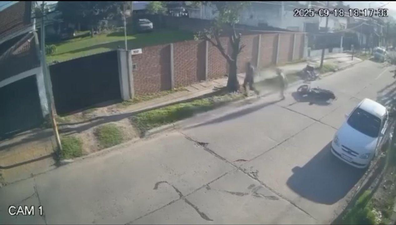 El video muestra cómo Cristian golpeó a los delincuentes hasta que uno escapó a pie. El otro recibió trompadas y patadas hasta caer de la moto, que quedó abandonada en el lugar.