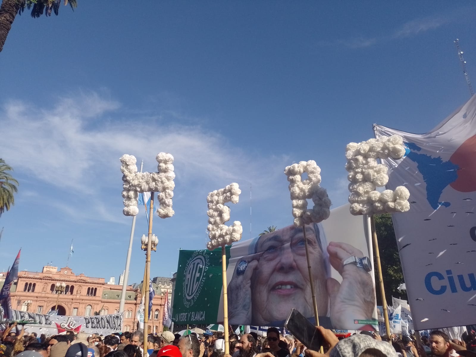 Ya pasaron 4 días, y la muerte todavía no pudo tocarla siquiera. Hebe está en esta Plaza. Hebe ya es eterna. Hebe es presencia para siempre. Gracias por todo, Hebe. Te queremos mucho. Y hasta la victoria, siempre.