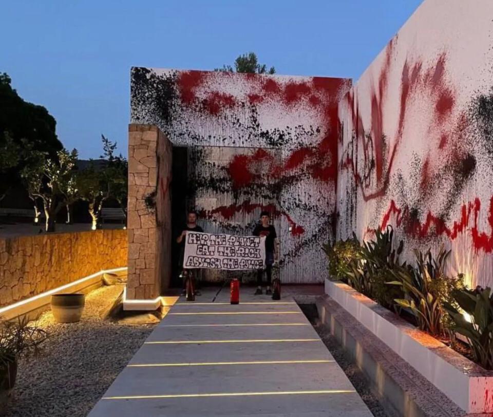 Se trata de integrantes de la agrupación Futuro Vegetal, quienes lograron ingresar a la propiedad y dejaron el siguiente mensaje: “Help the Planet – Eat the Rich – Abolish the Police”’ (Ayudar al planeta, comerse a los ricos y abolir la policía).