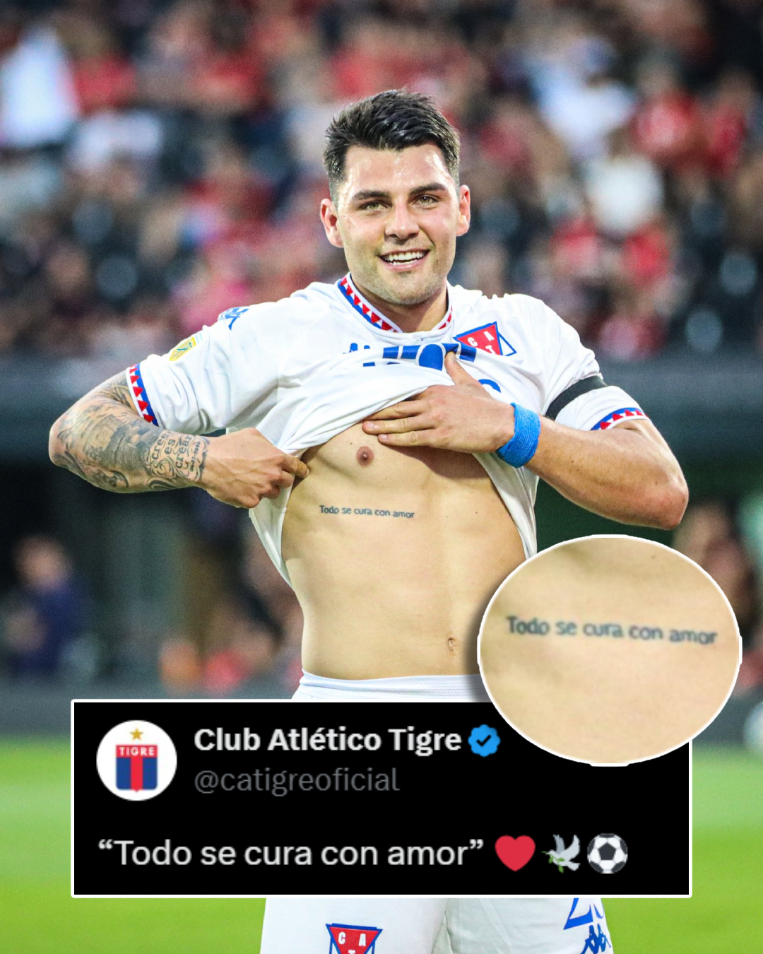 Luego del gol, el jugador mostró un tatuaje en su cuerpo con una de las frases características de su padre: “Todo se cura con amor”. La escena se viralizó en redes sociales y generó un fuerte impacto entre hinchas y colegas.