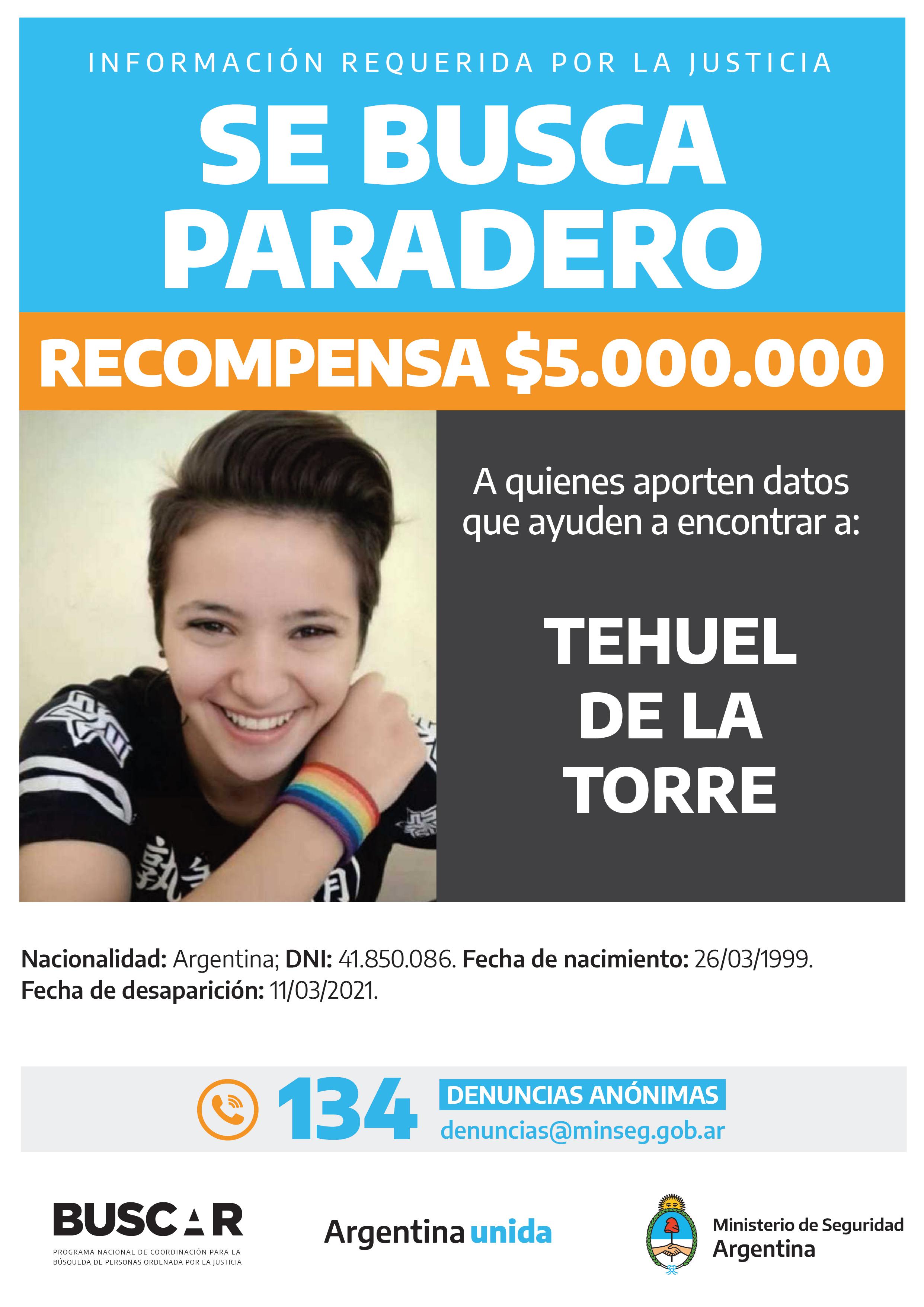 El Ministerio de Seguridad aumentó a 5 millones de pesos la recompensa para quienes reporten datos para encontrar a Tehuel De La Torre, el joven trans de 22 años que está desaparecido desde el 11 de marzo de 2021.