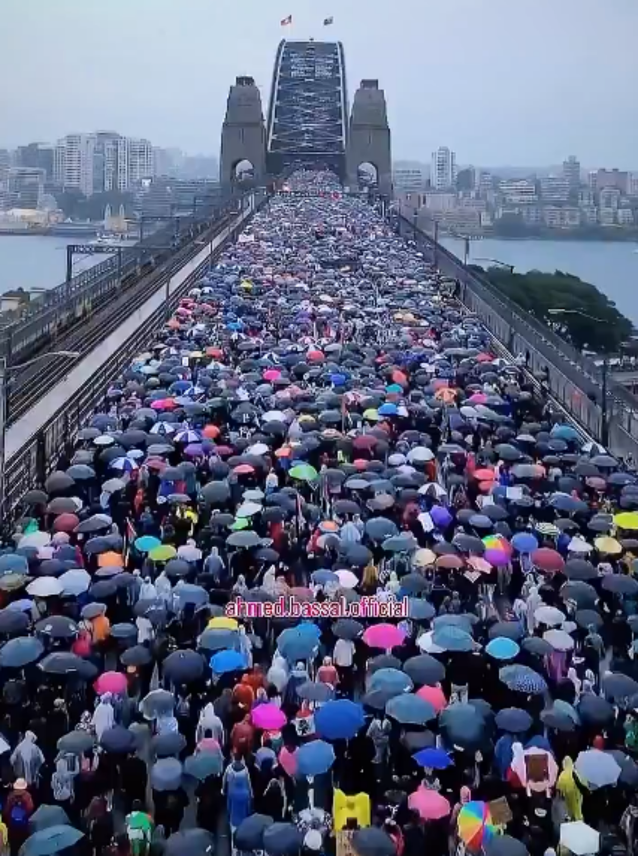 - La marcha atravesó el Puente del Puerto de Sydney bajo la lluvia