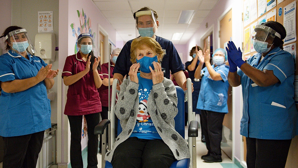 El Reino Unido decidió dar prioridad a los ancianos, sus cuidadores y al personal sanitario. La primera inyección fue recibida por Margaret Keenan, una británica que cumple 91 años la semana próxima, en un hospital de Coventry, en el centro de Inglaterra, en la fase inicial de un vasto programa de vacunación que ha sido bautizado «Día V».