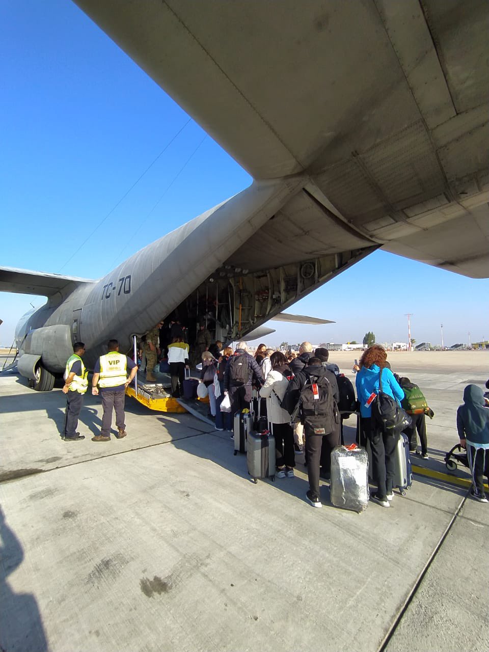 El Hércules había aterrizado pasadas las 10:40 (hora de Buenos Aires) en el aeropuerto Ben Gurion de Tel Aviv, y desde allí partió hacia Roma, alrededor de las 21.30, hora local (15.30 de la Argentina) con 78 conciudadanos que se encontraban en territorio del Estado de Israel.