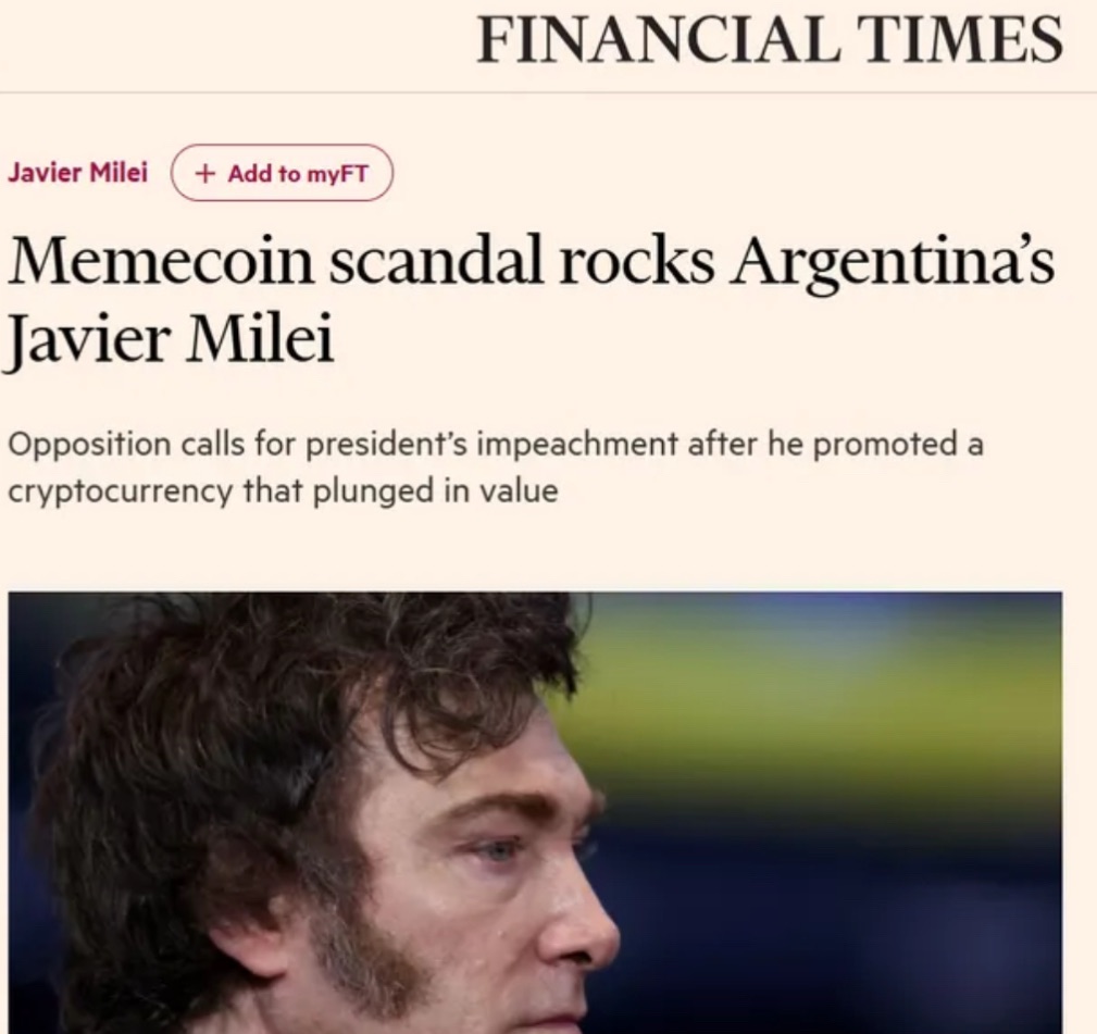 “El presidente libertario de Argentina, Javier Milei, se ha visto sacudido por un escándalo por su promoción de una memecoin cuyo valor se disparó antes de colapsar, lo que desencadenó pedidos de impeachment y demandas”, señaló el periódico británico.