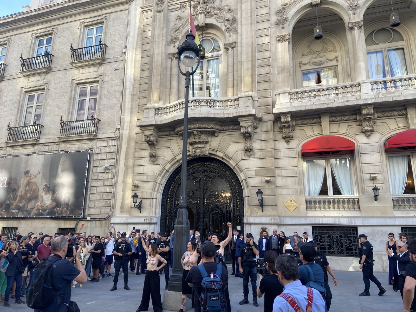 Como ocurrió en mayo pasado, cuando el Presidente visitó la capital española, militantes feministas se manifestaron contra Milei. «Caviar y Fascismo», fue una de las inscripciones que las jóvenes llevaron pintadas en el pecho.
