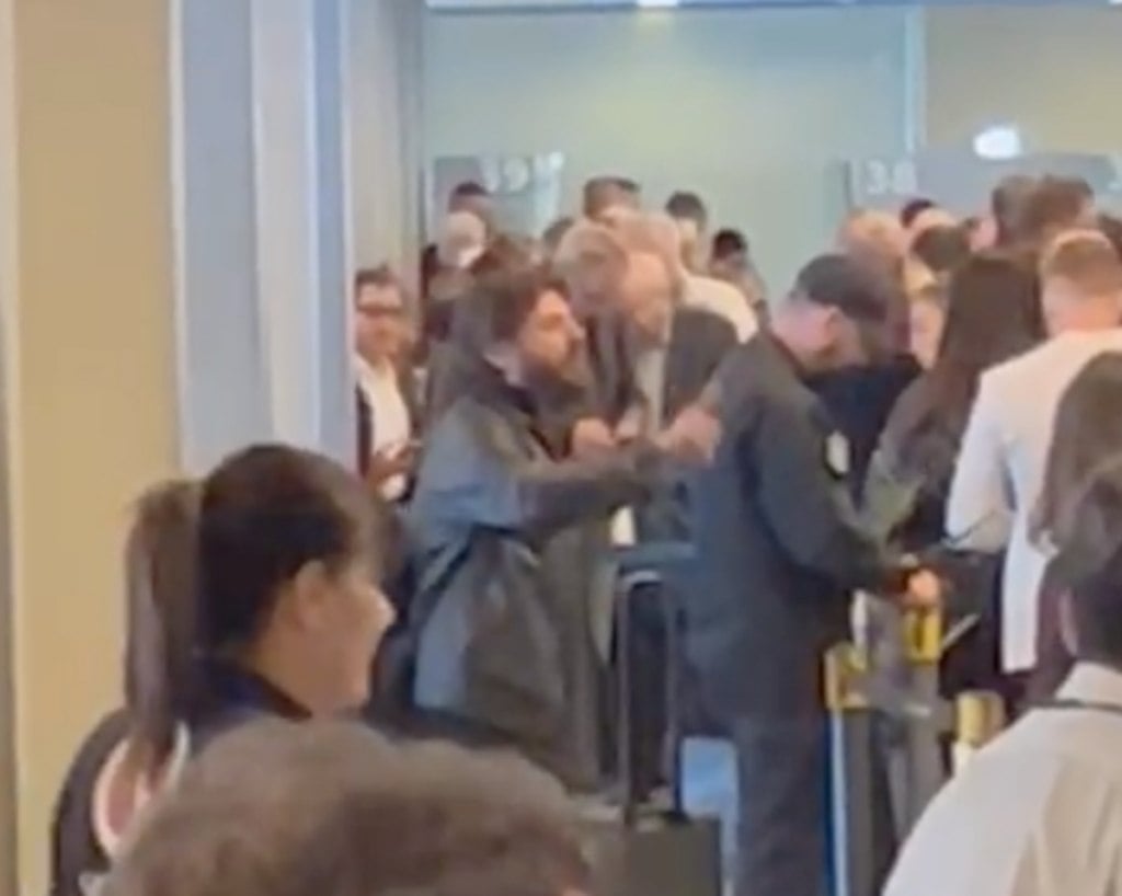 Un efectivo de la Policía de Seguridad Aeroportuaria (PSA), que intentó alejarlo de quienes estaban en la fila.