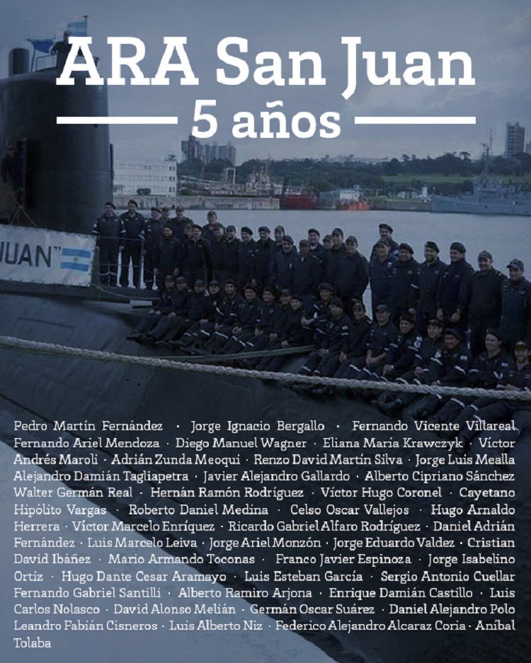 El submarino ARA San Juan (S-42) se hundía hace cinco años, un 15 de noviembre de 2017, en las profundidades del Atlántico sur como consecuencia de una serie de desperfectos técnicos que desencadenaron una tragedia en la que murieron sus 44 tripulantes, cuya recuerdo es honrado por sus familiares en un reclamo de justicia que no cesa.