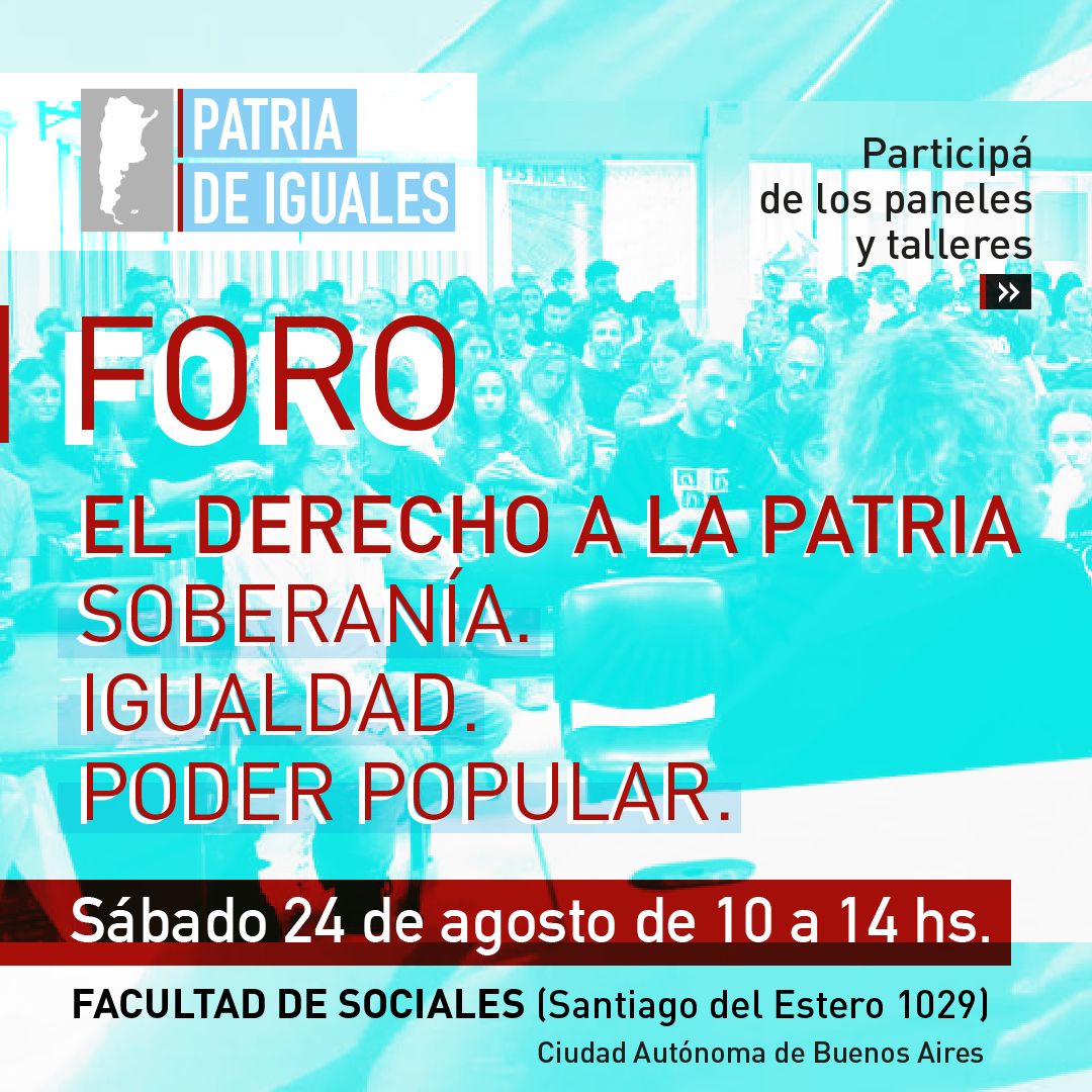 El espacio político PATRIA DE IGUALES realizará, el sábado 24 de agosto de 10 a 14 horas en la Facultad de Ciencias Sociales de la UBA, Santiago del Estero 1029; el FORO DE DEBATE: «El derecho a la Patria».