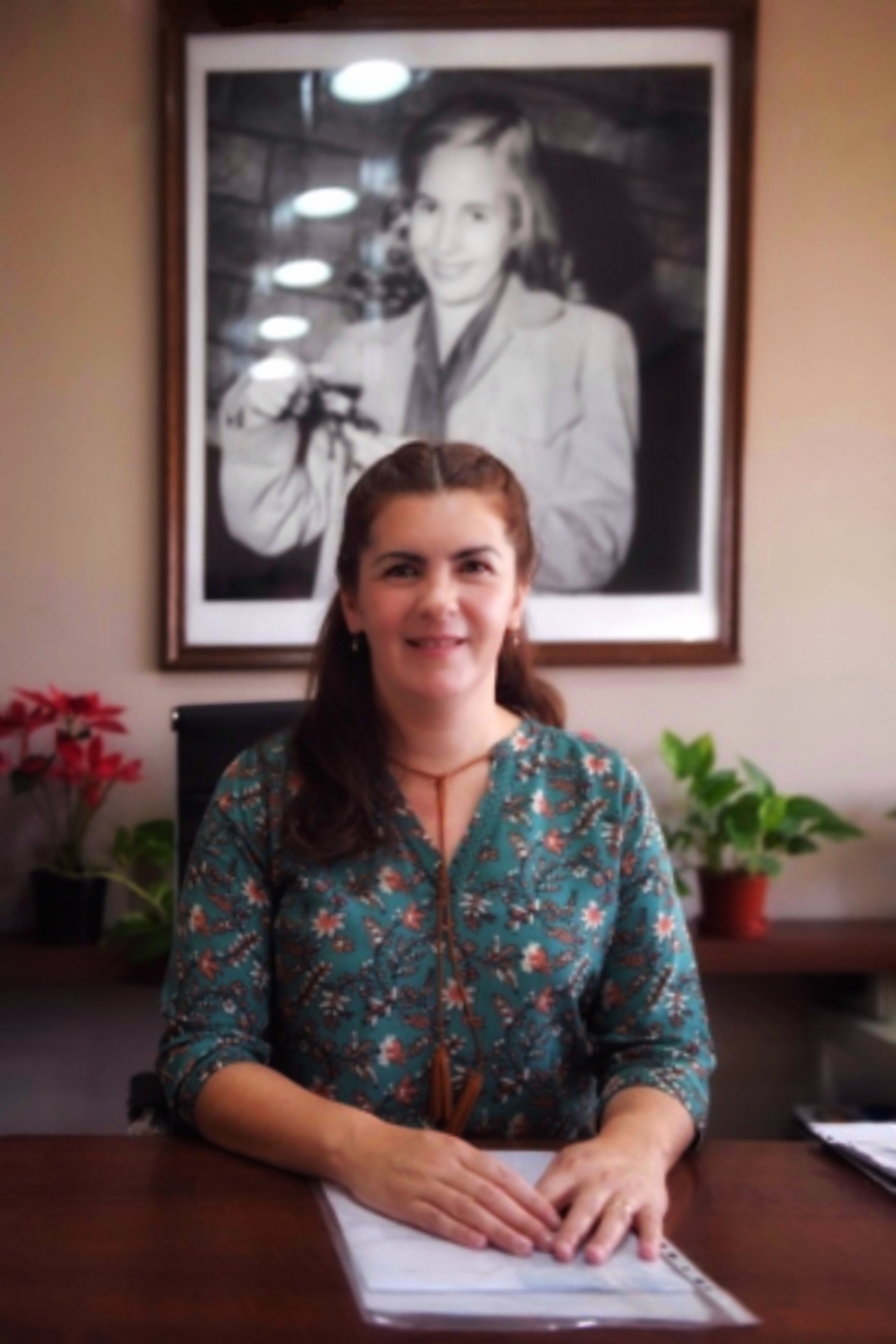 En su despacho, justo detrás de la silla que la intendenta usa regularmente, se impone una gran foto de Evita en color sepia: no se trata de un mero acto decorativo sino una suerte de ‘declaración de principios’.