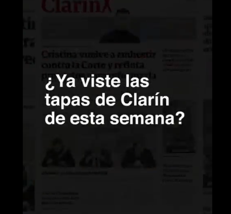 «Quiero compartir este video que vi hoy en redes. La verdad que esta semana Héctor no estuvo muy creativo en Clarín. Aclaro que fue Magnetto el que nos contó en Olivos que lo único que «miraba» antes de que se imprima el diario, era la tapa. ¿Pasarán el videito por TN?«, escribió Cristina Fernández de Kirchner en su cuenta personal de Twitter, donde puso un video que repasa cinco de las portadas de esta semana del diario Clarín.