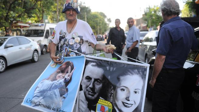 Además, se vendían remeras y gorros identificatorios del peronismo, con imágenes de los expresidentes Néstor Kirchner y Juan Domingo Perón, y de su esposa, Eva Perón, a los que, por el clima mundialista, se les sumaron las prendas con la imagen de Lionel Messi.