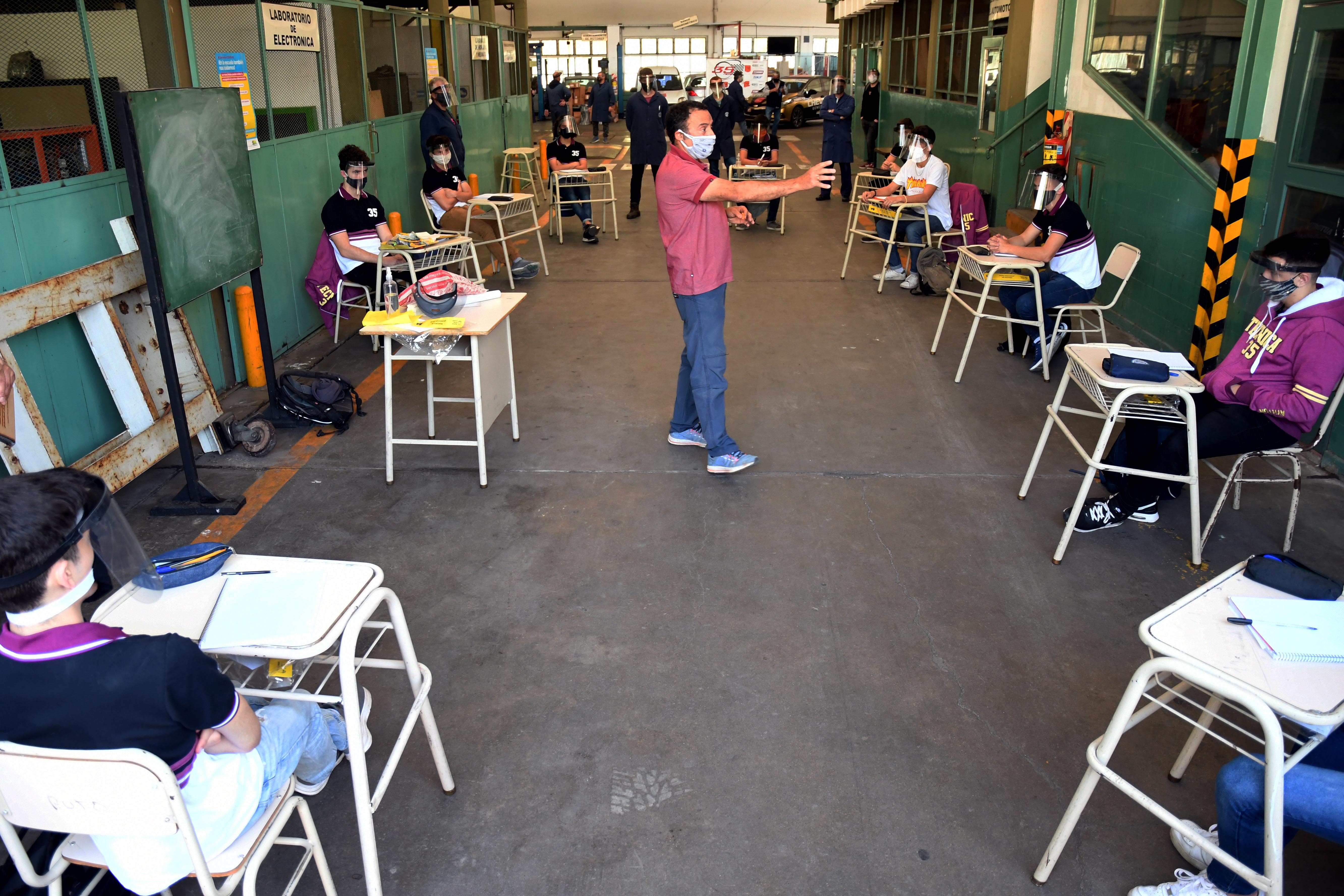 Arrancó el regreso a clases en la Ciudad: Estudiantes del último año de dos escuelas públicas técnicas comenzaron actividades escolares presenciales en la modalidad de grupos reducidos de 9 alumnos y en espacios abiertos dentro de los establecimientos.