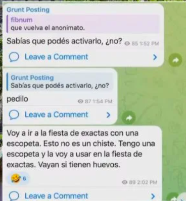 “Voy a ir a la fiesta de exactas con una escopeta. Esto no es un chiste. Tengo una escopeta y la voy a usar en la fiesta de exactas. Vayan si tienen huevos”, decía el mensaje que el atacante mandó.