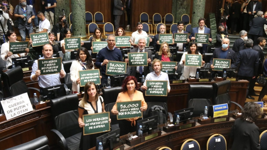 Los legisladores del Frente de Todos lo recibieron con carteles denunciando la falta de vacantes en las escuelas públicas de la Ciudad.