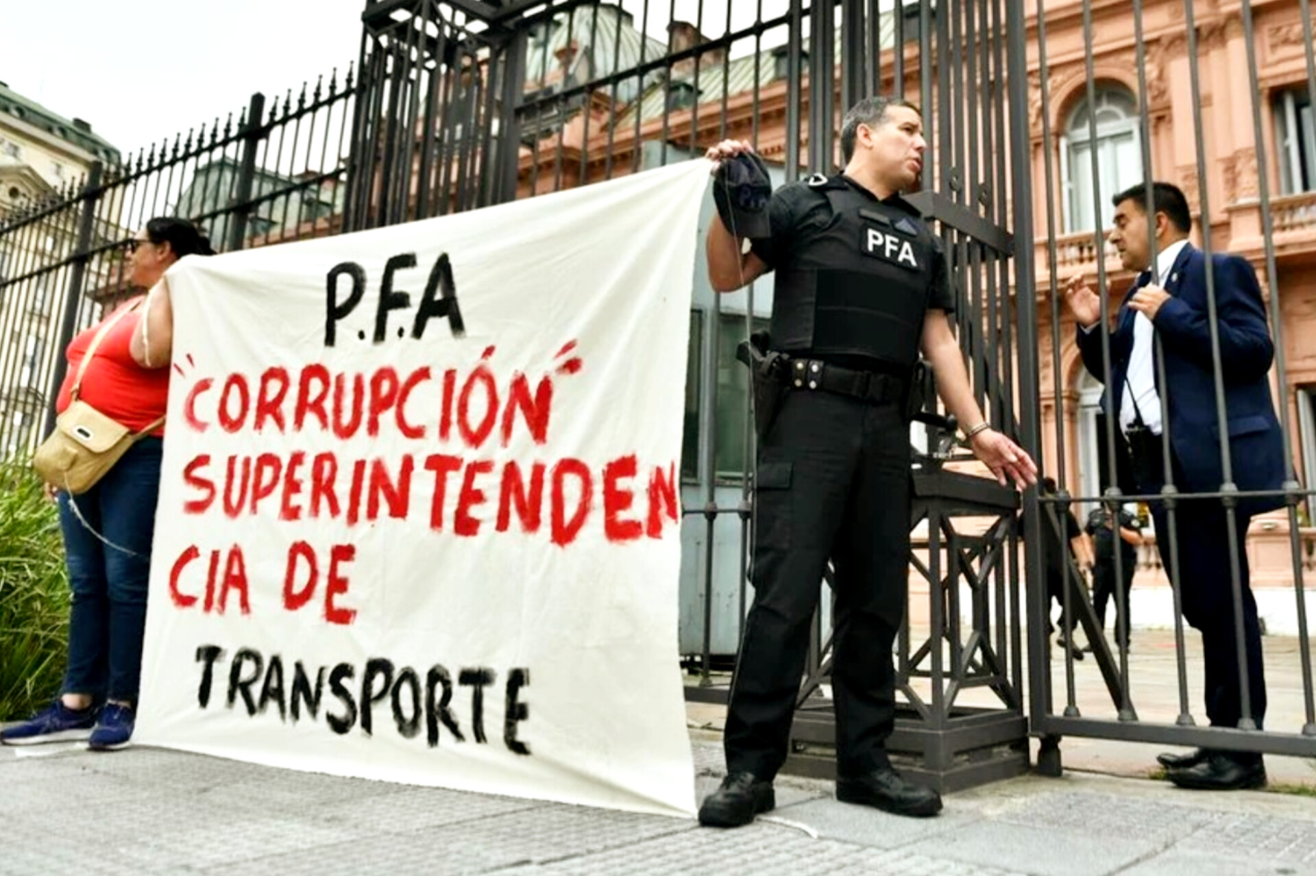 ★ Un agente de la Policía Federal Argentina protagonizó este miércoles por la mañana una protesta inédita al esposarse a las rejas de la Casa Rosada en reclamo por la situación salarial de la fuerza. El cabo Miguel Montiel permaneció encadenado durante varios minutos mientras portaba su arma de servicio reglamentaria y sostenía una pancarta que denunciaba hechos de corrupción en la Superintendencia de Transporte de la institución policial.