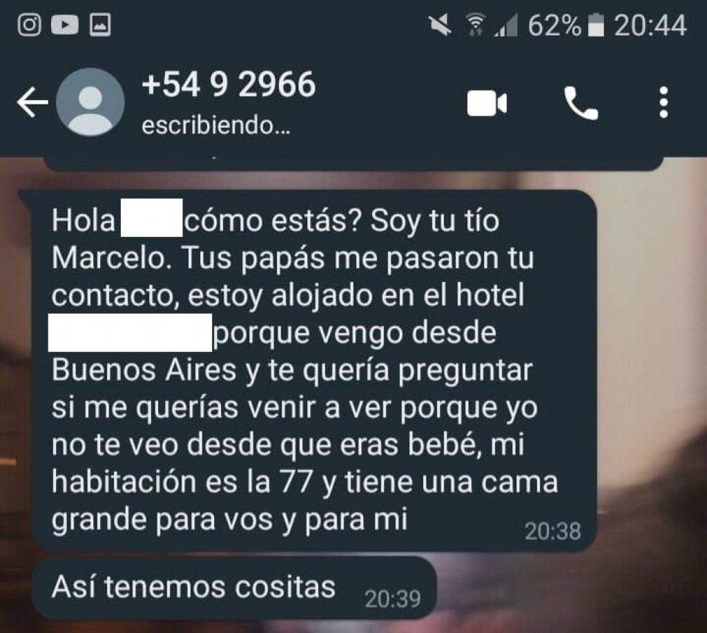 En el hecho, este sujeto invitaba a la nena a la habitación de un hotel de la ciudad santacruceña de El Calafate, donde le indicaba que había «una cama grande para poder hacer cositas». Tras la denuncia, una Fiscalía investiga el hecho e intenta dar con este acosador por las redes sociales.