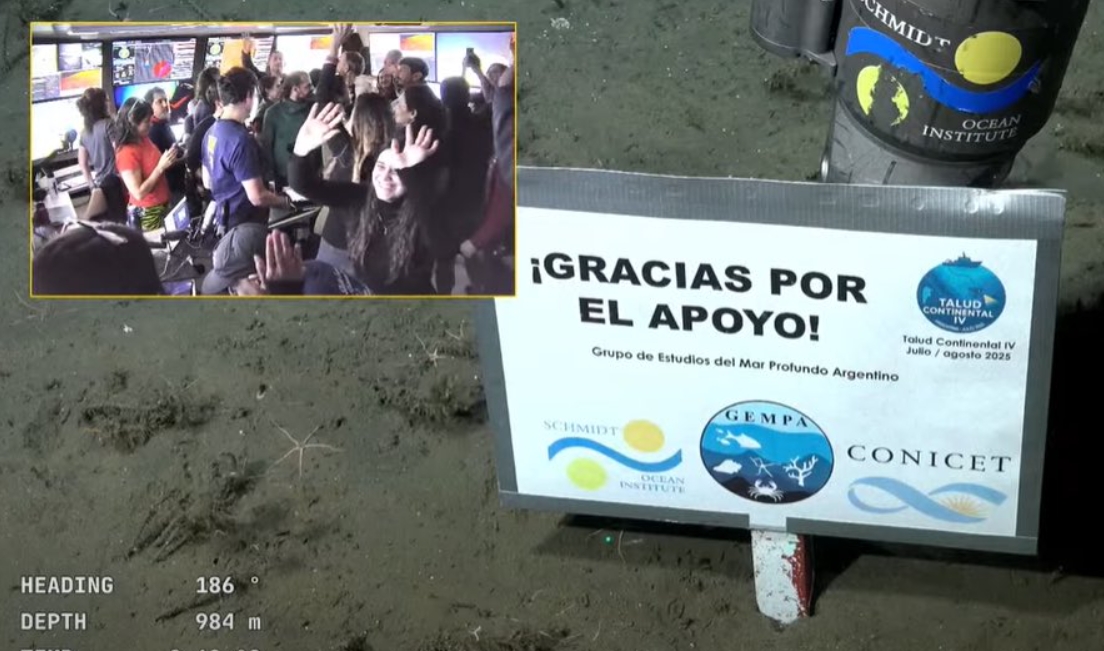 Durante la última inmersión del robot submarino, alrededor de las 16, los investigadores desplegaron un cartel con el mensaje: “Gracias por el apoyo”, dedicado a quienes siguieron de forma constante la expedición, en un contexto marcado por recortes presupuestarios en el sistema científico.