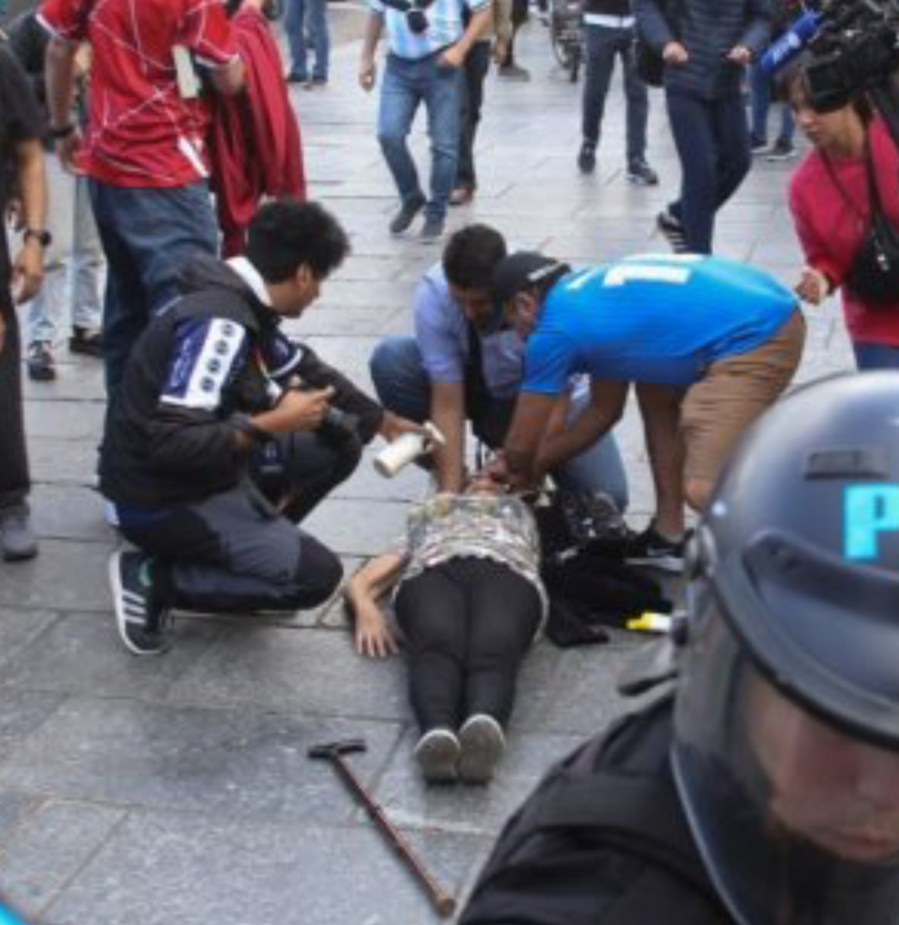 Entre los heridos se encuentra Beatriz Blanco, una jubilada de 87 años, quien sufrió una brutal agresión por parte de un efectivo policial. Mientras participaba pacíficamente en la protesta, un agente la golpeó en la cabeza con una cachiporra, cayendo de espaldas y con su cabeza golpeando en el asfalto, provocándole una herida que requirió asistencia médica inmediata. El momento quedó registrado en video y se viralizó rápidamente en las redes sociales.